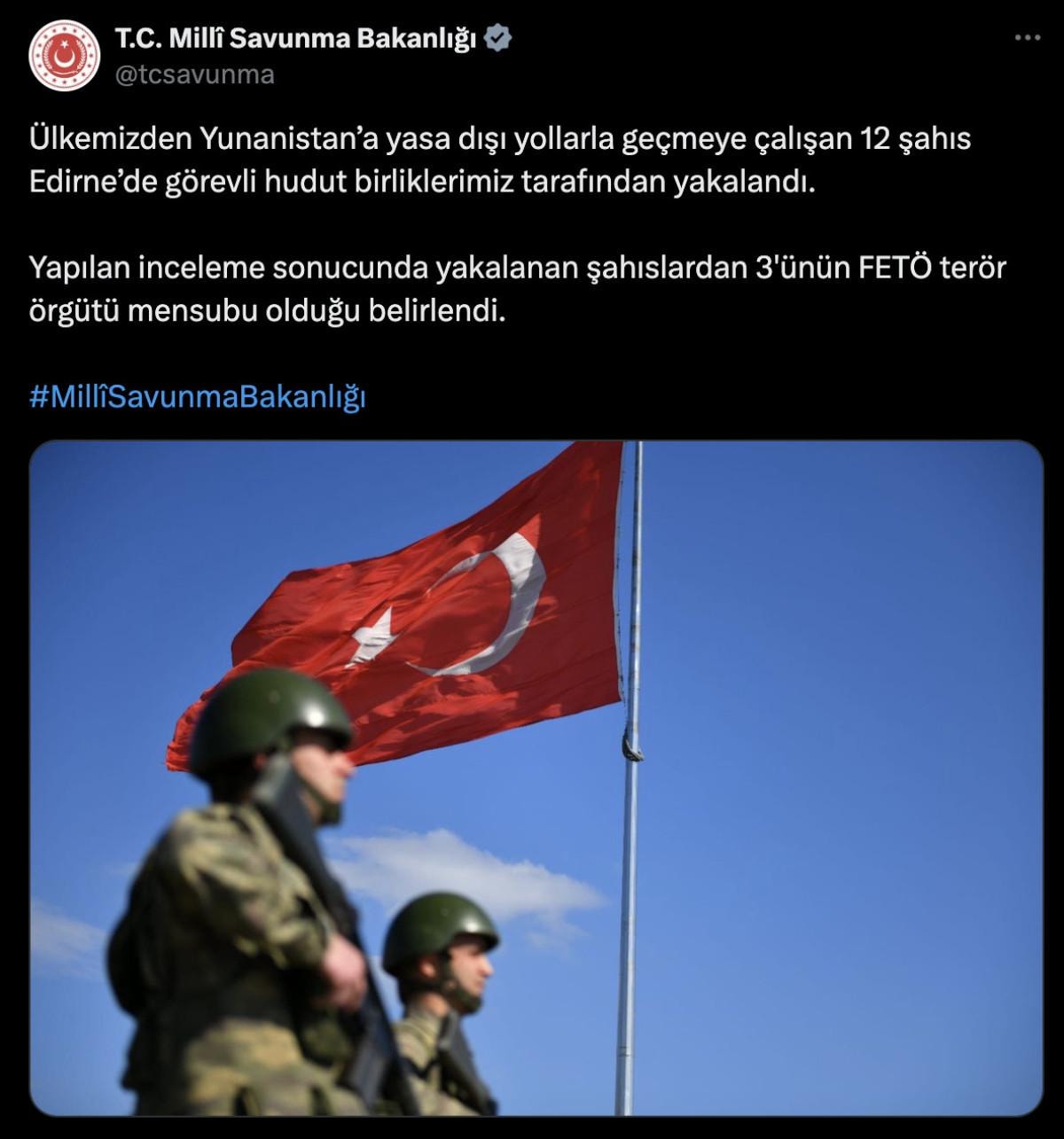 Son dakika haberine göre; Yunanistan'a kaçmaya çalışan 12 şahıs, Edirne’de görevli hudut birlikleri tarafından yakalandı. Yakalanan şahıslardan 3'ünün, FETÖ terör örgütü mensubu olduğu belirlendi.
