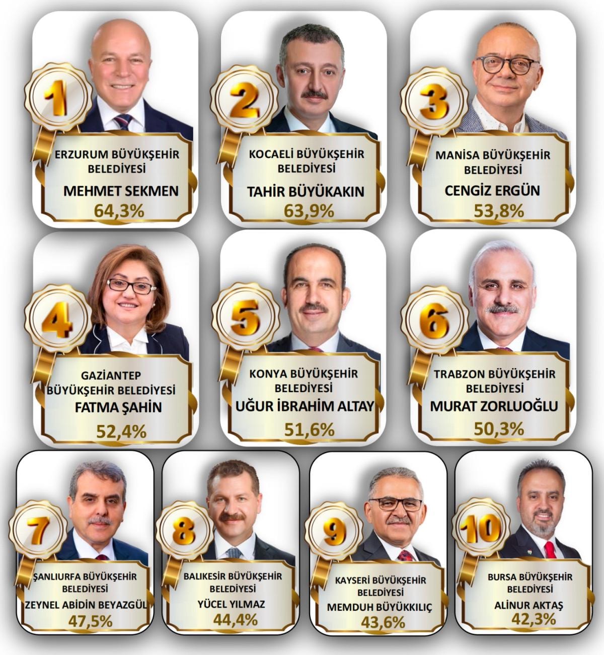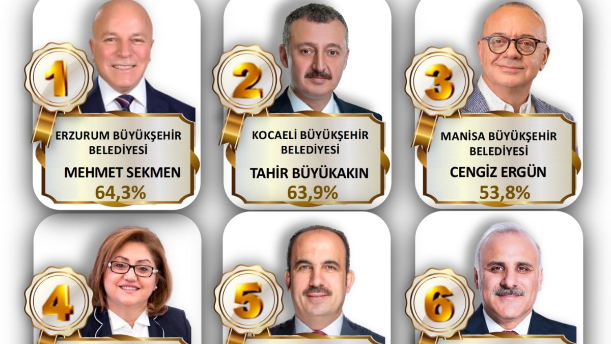 Sekmen'i yüzde 63,9 oranıyla Kocaeli Büyükşehir Belediye Başkanı Tahir Büyükakın takip ederken Manisa Büyükşehir Belediye Başkanı Cengiz Ergün yüzde 53,8 oranla üçüncü sırada yer aldı.