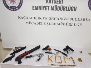 Kayseri Emniyet Müdürlüğü Kaçakçılık ve Organize Suçlarla Mücadele Şube Müdürlüğü (KOM) Organize Suçlar Büro Amirliği, sosyal medya üzerinden silah ticareti yaptığı öne sürülen H.Y.'yi gözaltına aldı. H.Y.'nin evinde yapılan aramada, 2 ruhsatsız tabanca, kısa ruhsatsız pompalı tüfek, 2 şarjör, 196 değişik çap ve markalarda fişek, 1 muşta, 4 kama ele geçirildi.