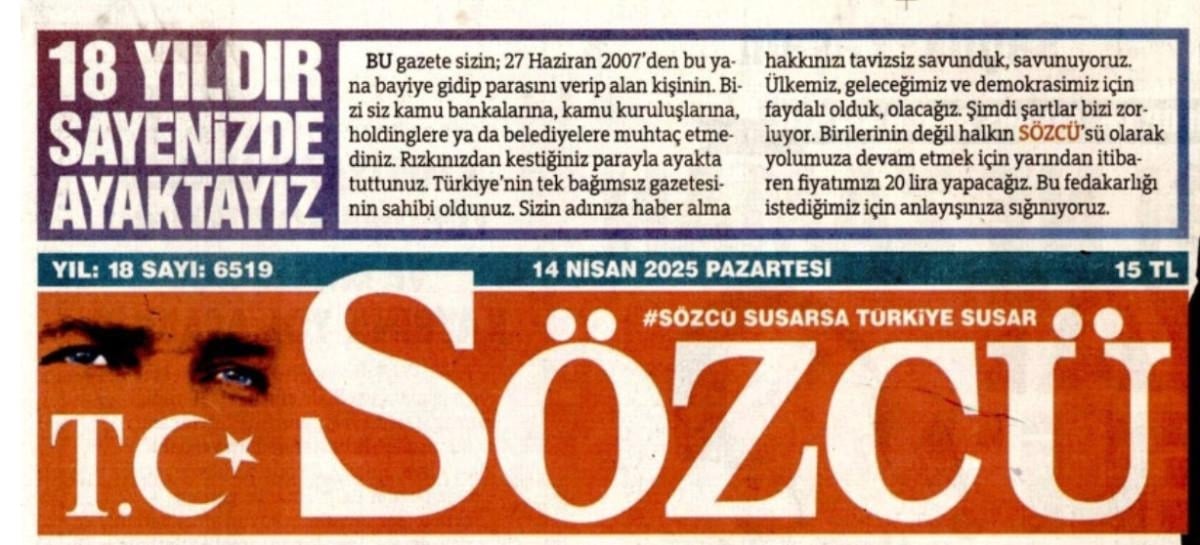 Bu gazete sizin; 27 Haziran 2007'den bu yana bayiye gidip parasını verip alan kişinin. Bizi siz kamu bankalarına, holdinglere ya da belediyelere muhtaç etmediniz. Rızkınızdan kestiğiniz parayla ayakta tuttunuz. Türkiye'nin tek bağımsız gazetesinin sahibi oldunuz. Sizin adınıza haber alma hakkınızı savunduk, savunuyoruz. Ülkemiz, geleceğimiz ve demokrasimiz için faydalı olduk olacağız. Şimdi şartlar bizi zorluyor. Birlerinin değil halkın Sözcü'sü olarak yolumuza devam etmek için yarından itibaren fiyatımızı 20 lira yapacağız. Bu fedakarlığı istediğimiz için anlayışınıza sığınıyoruz.