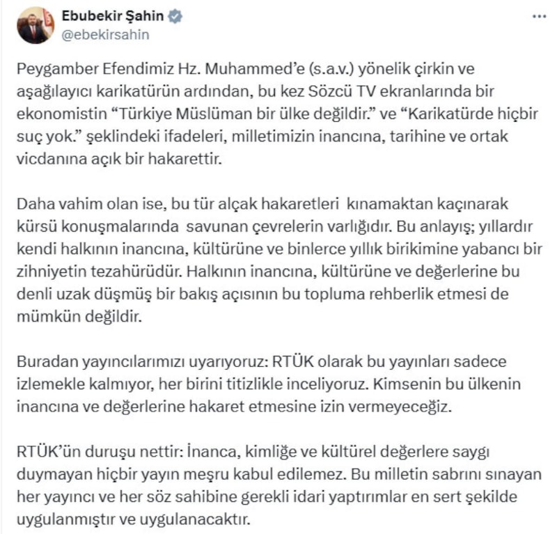Sözcü TV'ye katılan bir ekonomistin Leman adlı sözde mizah dergisinin skandal karikatürünü "Türkiye, Müslüman bir ülke değildir" sözleriyle savunmasının ardından RTÜK Başkanı Ebubekir Şahin, inceleme başlatıldığını duyurdu.