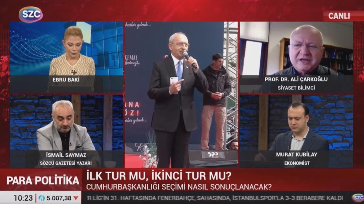 Programda söz alan Kubilay, Çarkoğlu'na "14 Mayıs tarihi üzerinden çok benzetme yapıldı, 1950’deki seçimler. Orada da CHP’yi şaşırtan Demokrat Parti lehine çok ciddi bir dip dalganın olmasıydı. Şu anda belkide Erdoğan'ın hiç kazanma şansı yok, belki Kılıçdaroğlu’na emek vermese bile çoktan kazandıracak güçlü bir dip dalga ihtimali yok mudur?Anketlere yansımamış böyle bir ihtimal yok mudur?" diye sordu.