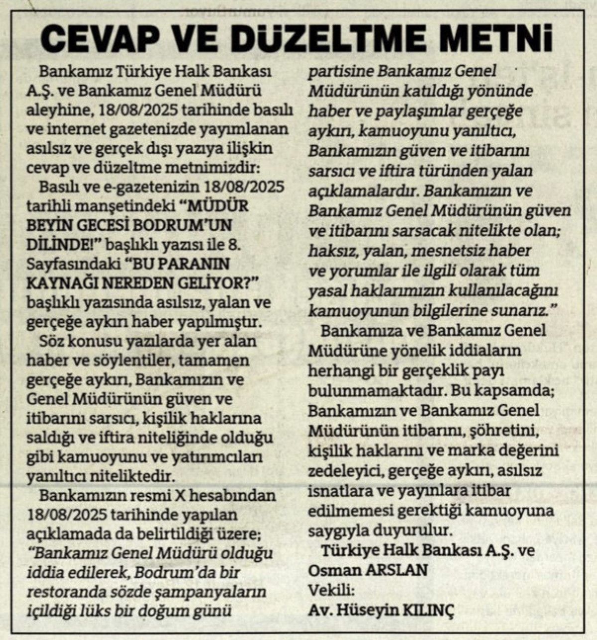 Genel Müdürümüzün Bodrum’da herhangi bir doğum günü organizasyonuna katıldığı iddiası tamamen gerçek dışıdır. Bankamızın güven ve itibarını hedef alan bu tür haksız, mesnetsiz haber ve yorumlar karşısında tüm yasal haklarımızı kullanacağımızı kamuoyunun bilgisine sunarız.