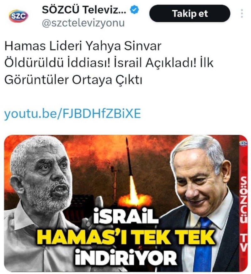 İsrail'in Hamas lideri Yahya Sinvar'ın öldürüldüğünü açıklaması sonrası Sözcü TV'nin terör devletini adeta öven manşeti, tepkilere neden oldu.