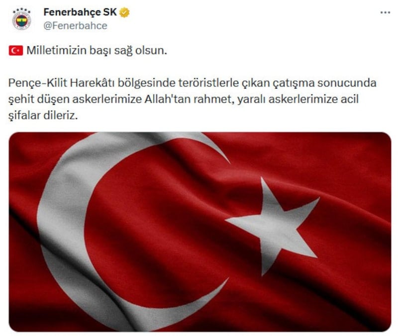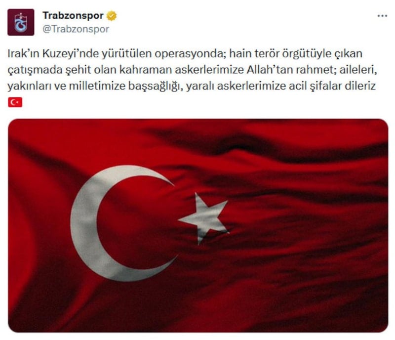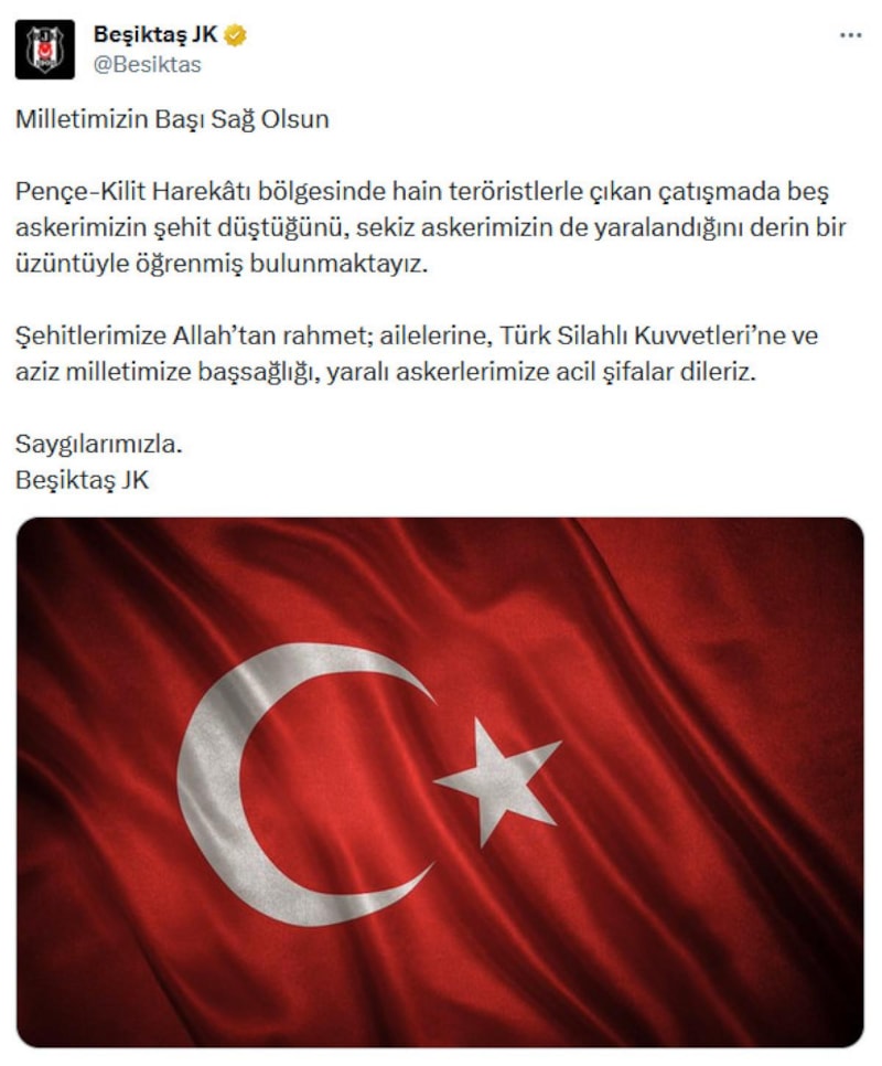 "Pençe-Kilit Harekatı operasyon bölgesinde hain terör örgütü mensuplarıyla yaşanan çatışmada şehit düşen kahraman askerlerimize Allah'tan rahmet; kederli ailelerine, Türk Silahlı Kuvvetlerimize ve milletimize başsağlığı, yaralı Mehmetçiklerimize acil şifalar diliyoruz. Aziz şehitlerimiz anısına 13, 14 ve 15 Ocak tarihlerinde oynanacak tüm müsabakalar öncesinde 1 dakikalık saygı duruşunda bulunulacak. Kulüplerimiz siyah kol bandıyla sahaya çıkacak."