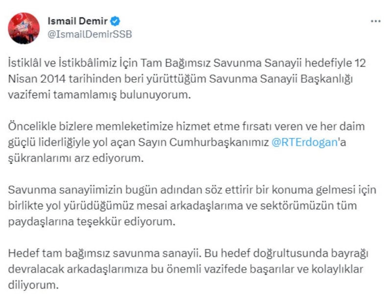 İstiklâl ve İstikbâlimiz İçin Tam Bağımsız Savunma Sanayii hedefiyle 12 Nisan 2014 tarihinden beri yürüttüğüm Savunma Sanayii Başkanlığı vazifemi tamamlamış bulunuyorum.
