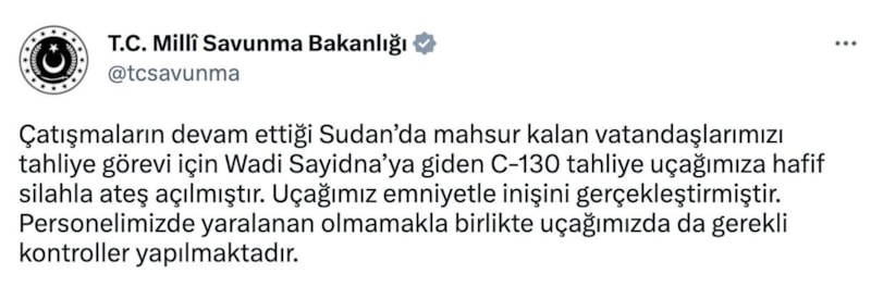 Çatışmaların devam ettiği Sudan’da mahsur kalan vatandaşlarımızı tahliye görevi için Wadi Sayidna’ya giden C-130 tahliye uçağımıza hafif silahla ateş açılmıştır. Uçağımız emniyetle inişini gerçekleştirmiştir. Personelimizde yaralanan olmamakla birlikte uçağımızda da gerekli kontroller yapılmaktadır.
