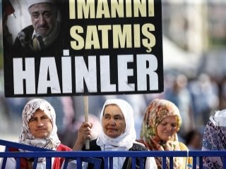 "Asımın nesli darbecileri yendi", FETÖ'cü hainlere en ağır ceza verilsin", "İmanını satmış hainler" ve "Darbe yapmak maklube yapmaya benzemez" gibi yazan dövizler taşıyan kalabalık, sık sık örgüt ve elebaşı Fetullah Gülen aleyhine slogan attı.