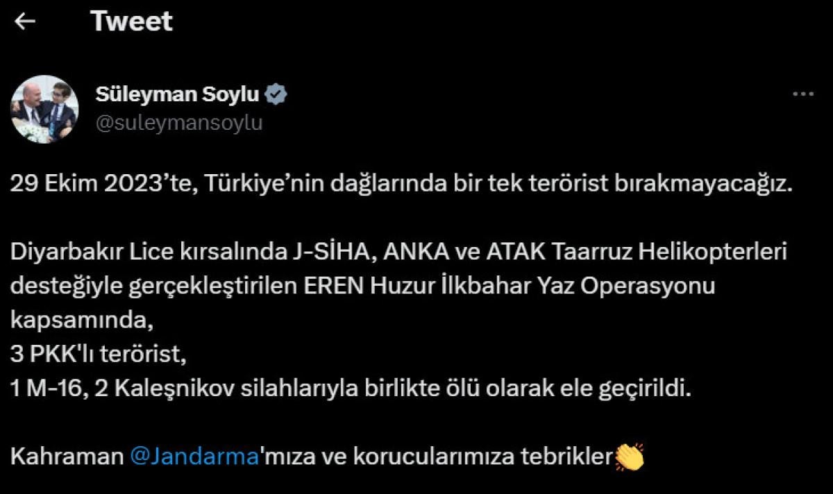 Soylu açıklamasında, "9 Ekim 2023’te, Türkiye’nin dağlarında bir tek terörist bırakmayacağız. Diyarbakır Lice kırsalında J-SİHA, ANKA ve ATAK Taarruz Helikopterleri desteğiyle gerçekleştirilen EREN Huzur İlkbahar Yaz Operasyonu kapsamında, 3 PKK'lı terörist, 1 M-16, 2 Kaleşnikov silahlarıyla birlikte ölü olarak ele geçirildi. Kahraman @Jandarma 'mıza ve korucularımıza tebrikler" dedi.