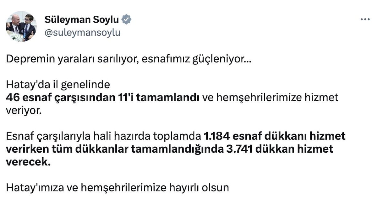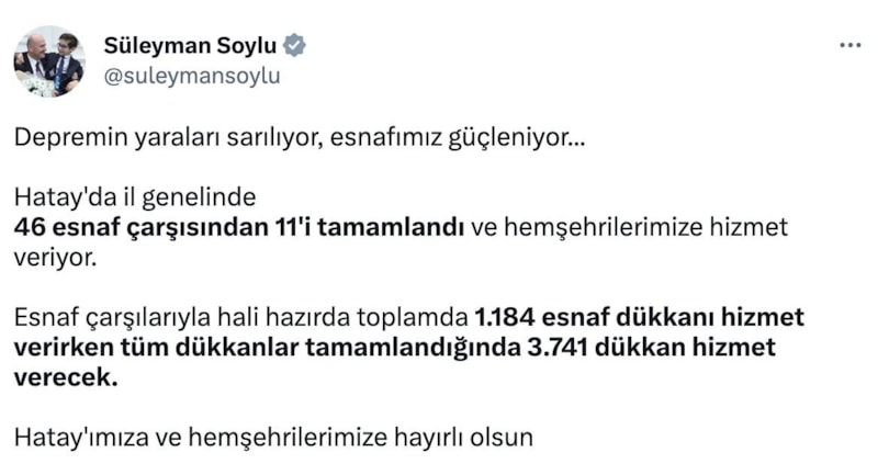 Bakan Soylu, Hatay'da 1.184 esnaf dükkanı hizmet verirdiğini açıkladı.
