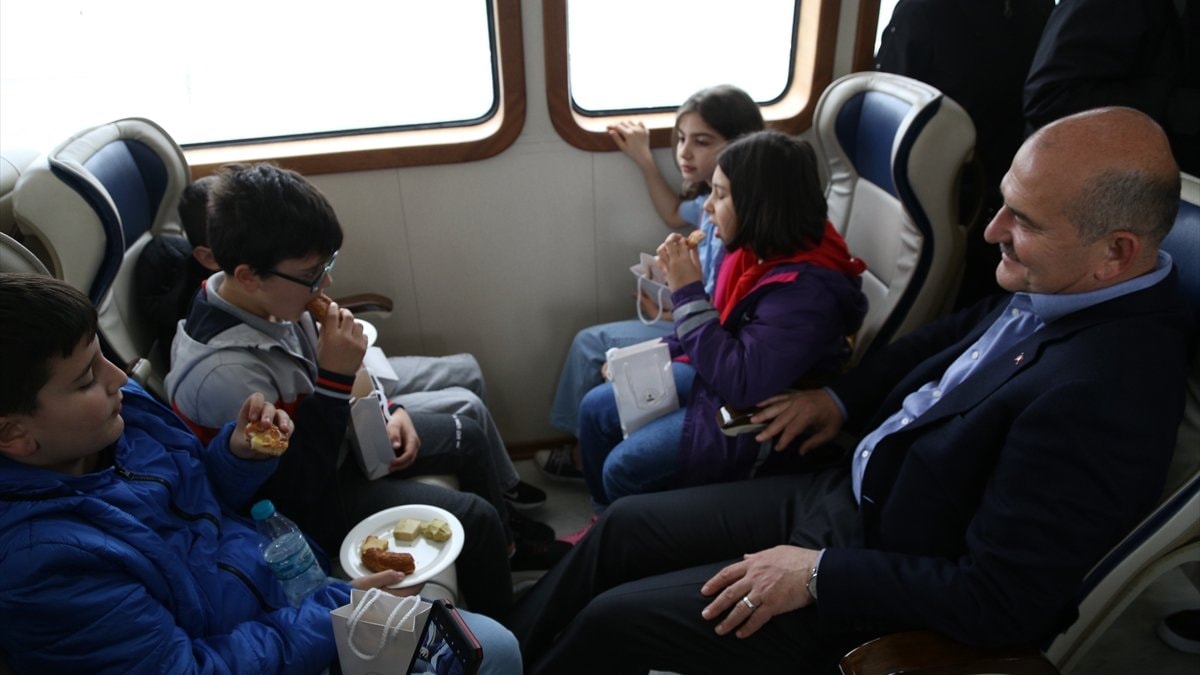Bu esnada geminin güvenliğini sağlayan Sahil Güvenlik ve Polis botlarını çocuklara gösteren Soylu, "Bizde bu botlardan çok var. Bize eşlik ediyorlar" dedi.