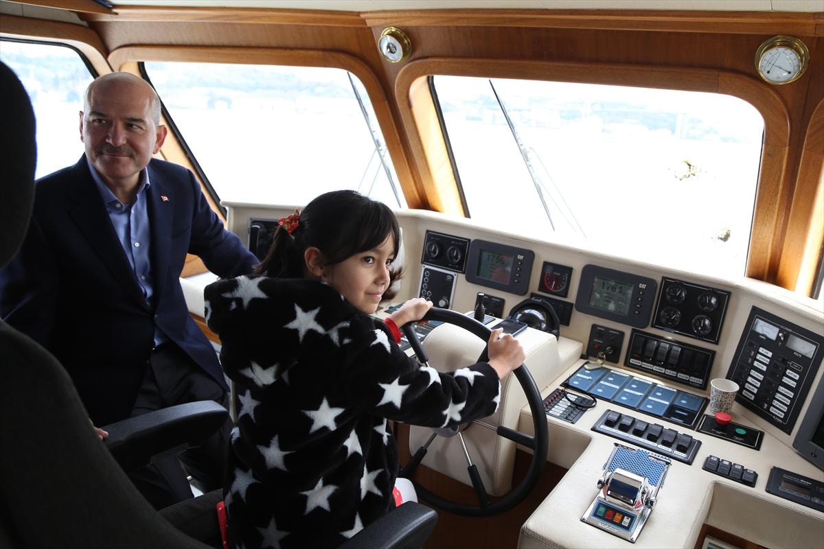 Sarıyer İlköğretim Okulu öğrencilerinden Berna Çınar'ı ve Muhammet Ali Kart'ı botun kaptan koltuğuna oturtan Bakan Soylu, çocuklarla şakalaştı.