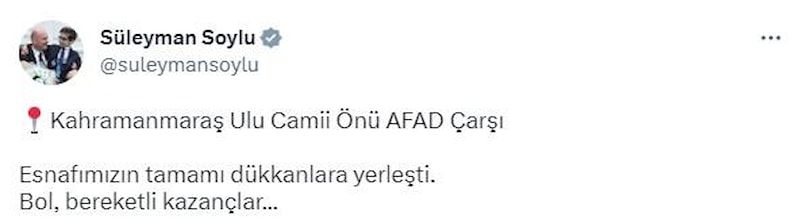 Depremin merkezi Kahramanmaraş'a giden İçişleri Bakanı Süleyman Soylu, AFAD tarafından tamamlanan çarşıda, esnafların işbaşı yaptığını açıkladı.