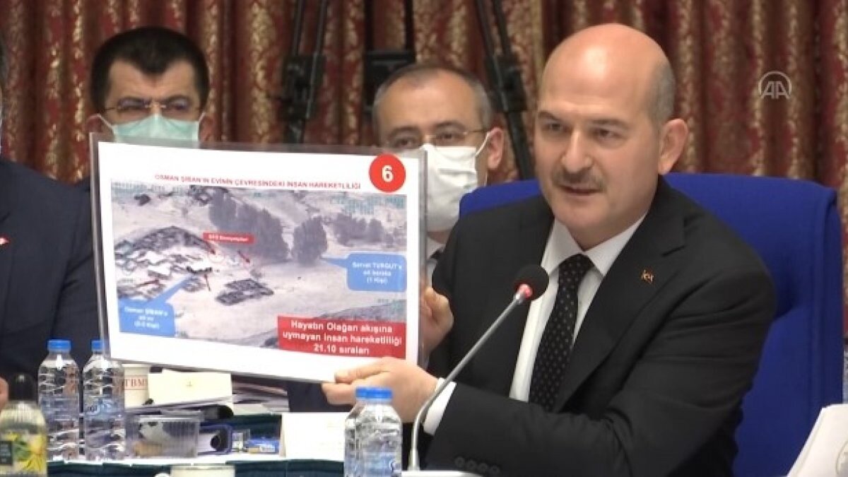 Güvenlik güçlerinin, 4 evin olduğu mezrayı insansız hava araçlarıyla (İHA) izlemeye başladıklarını belirten Soylu, İHA'lar tarafından çekilen fotoğrafları göstererek Osman Şiban'ın evine 3 teröristin geldiğini söyledi.