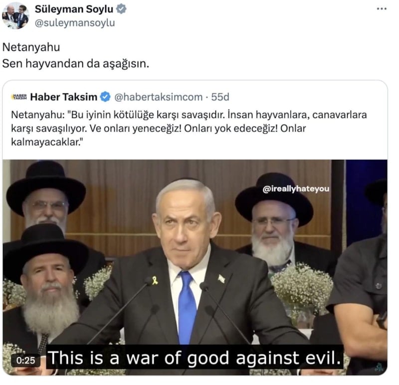 Netanyahu: "Bu iyinin kötülüğe karşı savaşıdır. İnsan hayvanlara, canavarlara karşı savaşılıyor. Ve onları yeneceğiz! Onları yok edeceğiz! Onlar kalmayacaklar." sözlerini gören Süleyman Soylu, şöyle dedi: