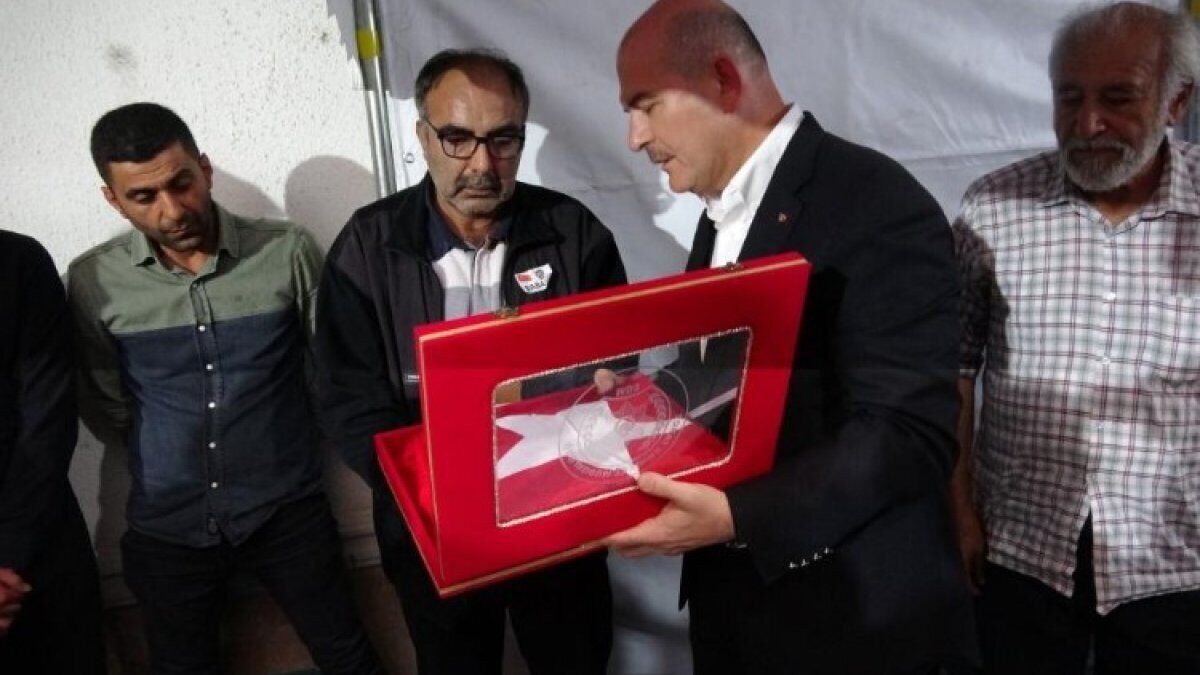 Bakan Soylu, şehidin babası Mehmet Çalışgan'a şehidin tabutuna örtülü Türk bayrağı ile fotoğrafını takdim etti.