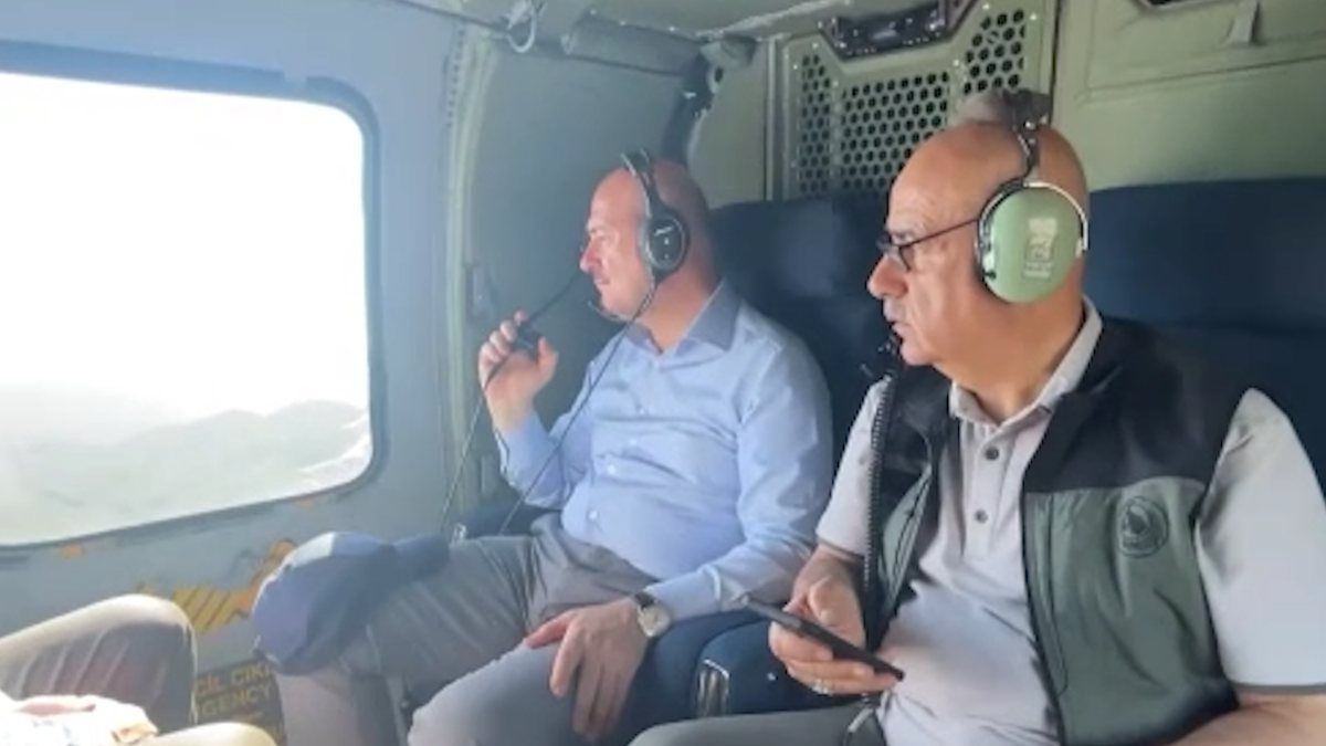 Soylu ve Kirişçi, incelemelerine bugün de devam etti. İki bakan, yangın sahasını helikopterle havadan denetledi.