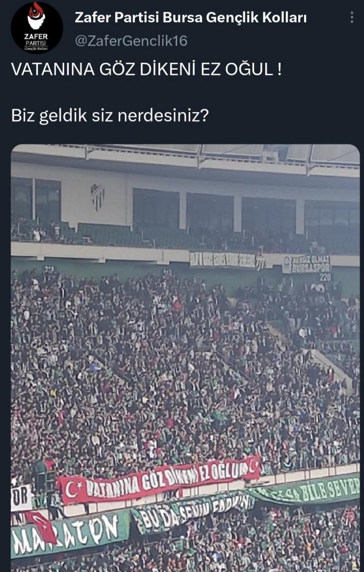 Zafer Partisi Bursa Gençlik Kolları hesabından paylaşılan bir fotoğrafta tribünden bir karenin üzerine "Vatanına göz dikeni ez oğul! Biz geldik, siz neredesiniz?" ifadeleri yazıldı.