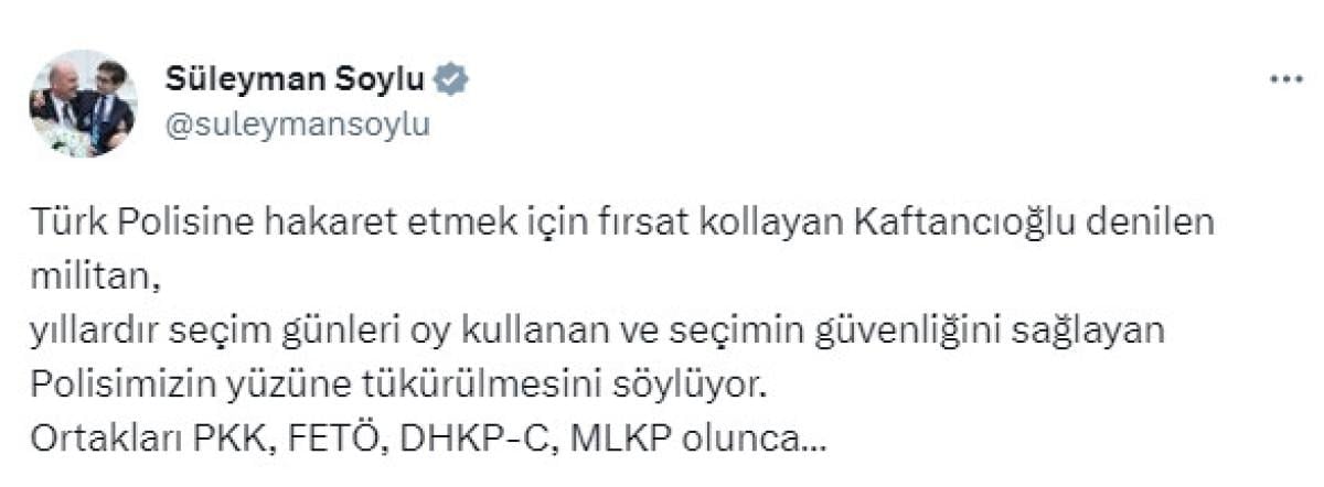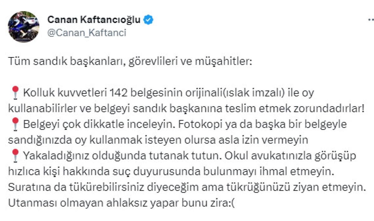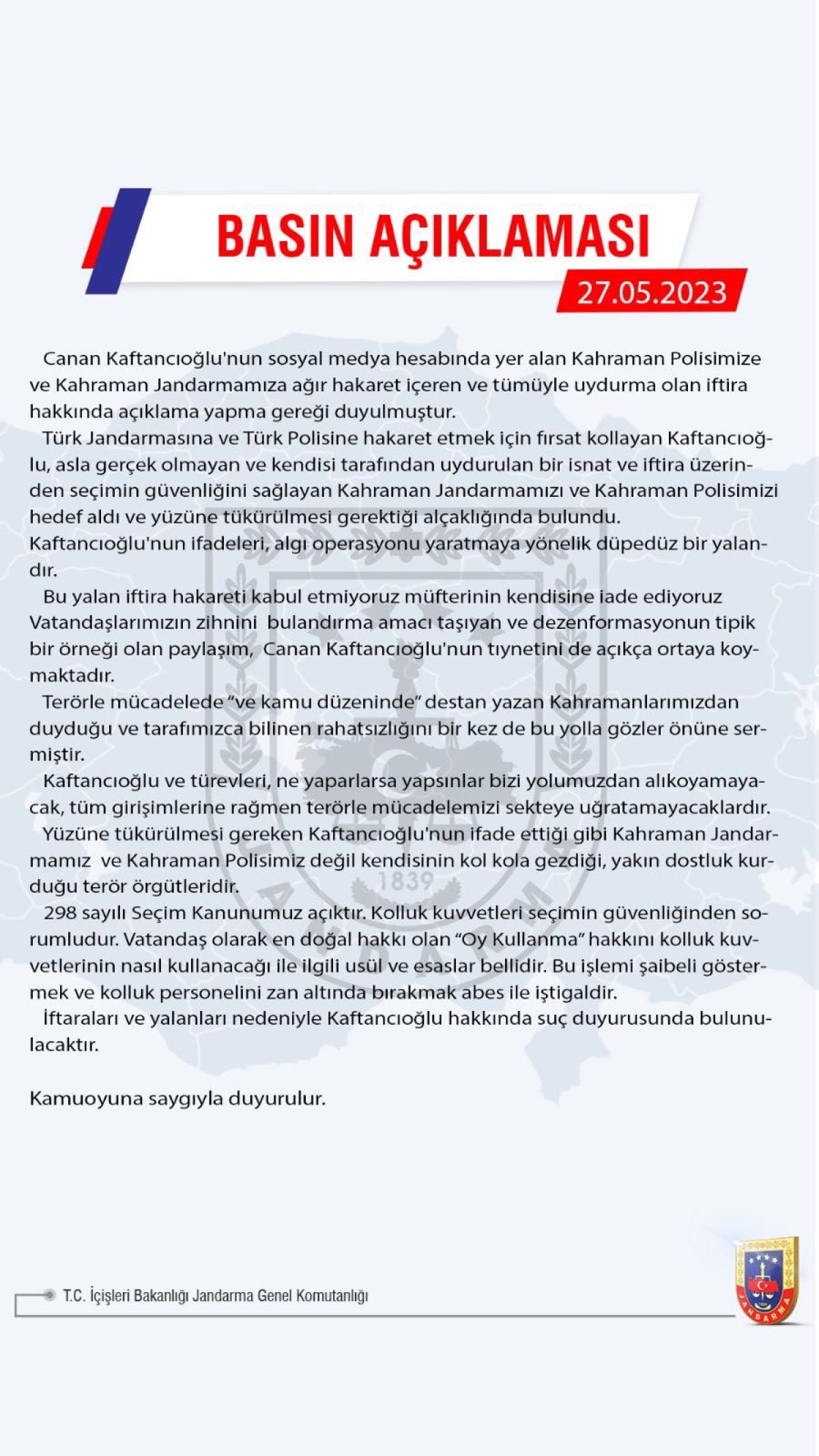 Canan Kaftancıoğlu'nun sosyal medya hesabında yer alan kahraman polisimize ve kahraman jandarmamıza ağır hakaret içeren ve tümüyle uydurma olan iftira hakkında açıklama yapma gereği duyulmuştur. Türk polisine ve Türk jandarmasına hakaret etmek için fırsat kollayan Kaftancıoğlu, asla gerçek olmayan ve kendisi tarafından uydurulan bir isnat ve iftira üzerinden seçimin güvenliğini sağlayan kahraman polisimiz ve kahraman jandarmamızı hedef aldı ve yüzüne tükürülmesi gerektiği alçaklığında bulundu. Kaftancıoğlu'nun ifadeleri, algı operasyonu oluşturmaya yönelik düpedüz bir yalandır. Bu yalan, iftira ve hakareti kabul etmiyoruz, müfterinin kendisine iade ediyoruz. Vatandaşlarımızın zihnini bulandırma amacı taşıyan ve dezenformasyonun tipik bir örneği olan paylaşım, Canan Kaftancıoğlu'nun tıynetini de açıkça ortaya koymaktadır. Terörle mücadelede ve kamu düzeninde destan yazan kahramanlarımızdan duyduğu ve tarafımızca bilinen rahatsızlığını bir kez de bu yolla gözler önüne sermiştir. Kaftancıoğlu ve türevleri, ne yaparlarsa yapsınlar bizi yolumuzdan alıkoyamayacak, tüm girişimlerine rağmen terörle mücadelemizi sekteye uğratamayacaklardır. Yüzüne tükürülmesi gereken Kaftancıoğlu'nun ifade ettiği gibi kahraman polisimiz ve kahraman jandarmamız değil kendisinin kol kola gezdiği, yakın dostluk kurduğu terör örgütleridir. İftiraları ve yalanları nedeniyle Kaftancıoğlu hakkında suç duyurusunda bulunulacaktır.
