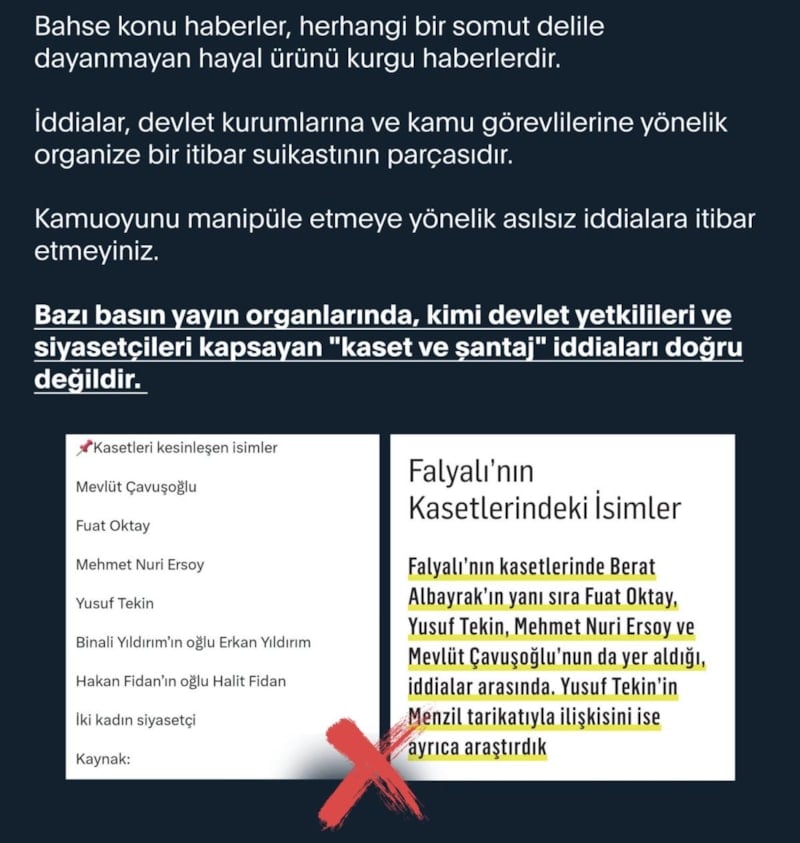 Açıklamada, "Bazı basın yayın organlarında, kimi devlet yetkilileri ve siyasetçileri kapsayan 'kaset ve şantaj' iddiaları doğru değildir. Bahse konu haberler, herhangi bir somut delile dayanmayan hayal ürünü kurgu haberlerdir. İddialar, devlet kurumlarına ve kamu görevlilerine yönelik organize bir itibar suikastının parçasıdır. Kamuoyunu manipüle etmeye yönelik asılsız iddialara itibar etmeyiniz." ifadeleri kullanıldı.