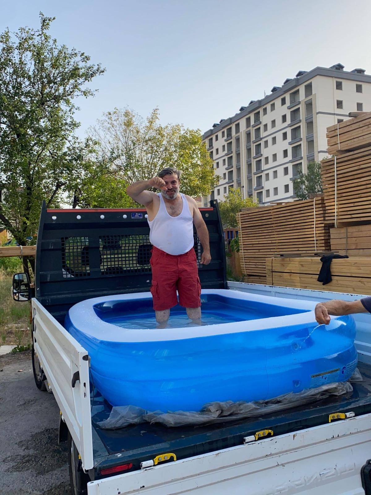Saim Kuş, hem kendisinin hem de iş yerinde çalışan personelinin serinlemesi için kamyonet kasasına portatif havuz kurdu.
