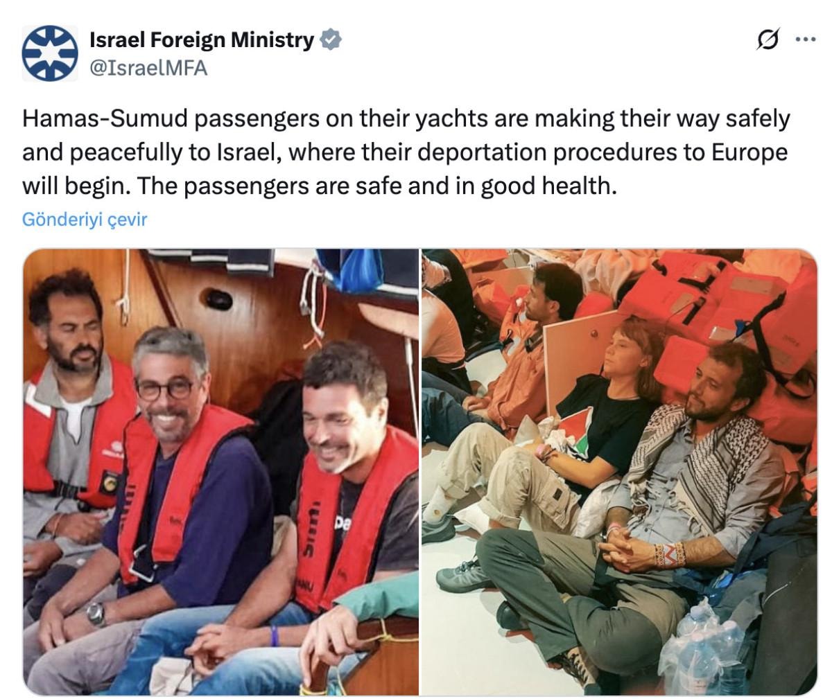 İsrail Dışişleri Bakanlığın'ın Amerikan X şirketinin sosyal medya platformundan yapılan açıklamada, Sumud Filosu'ndaki bazı aktivistlerin İsrail'e götürüldüğü belirtildi.