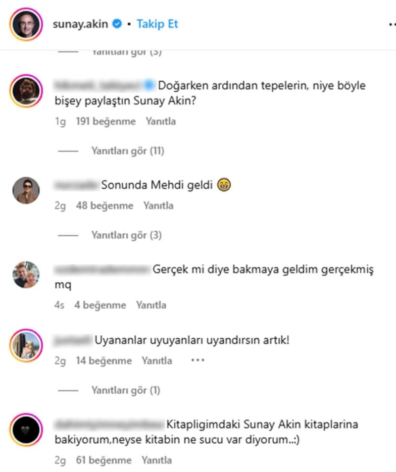 Birçok sosyal medya kullanıcısı, paylaşımın altında, yapılan paylaşımı anlamsız bularak Sunay Akın'a tepki gösterdi.