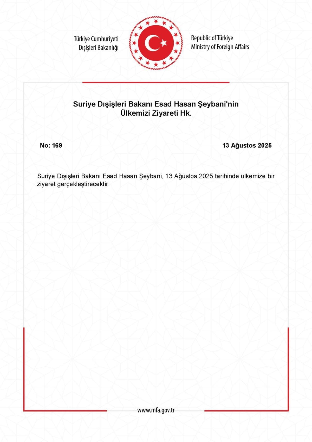 "Suriye Dışişleri Bakanı Esad Hasan Şeybani, 13 Ağustos 2025 tarihinde ülkemize bir ziyaret gerçekleştirecek."