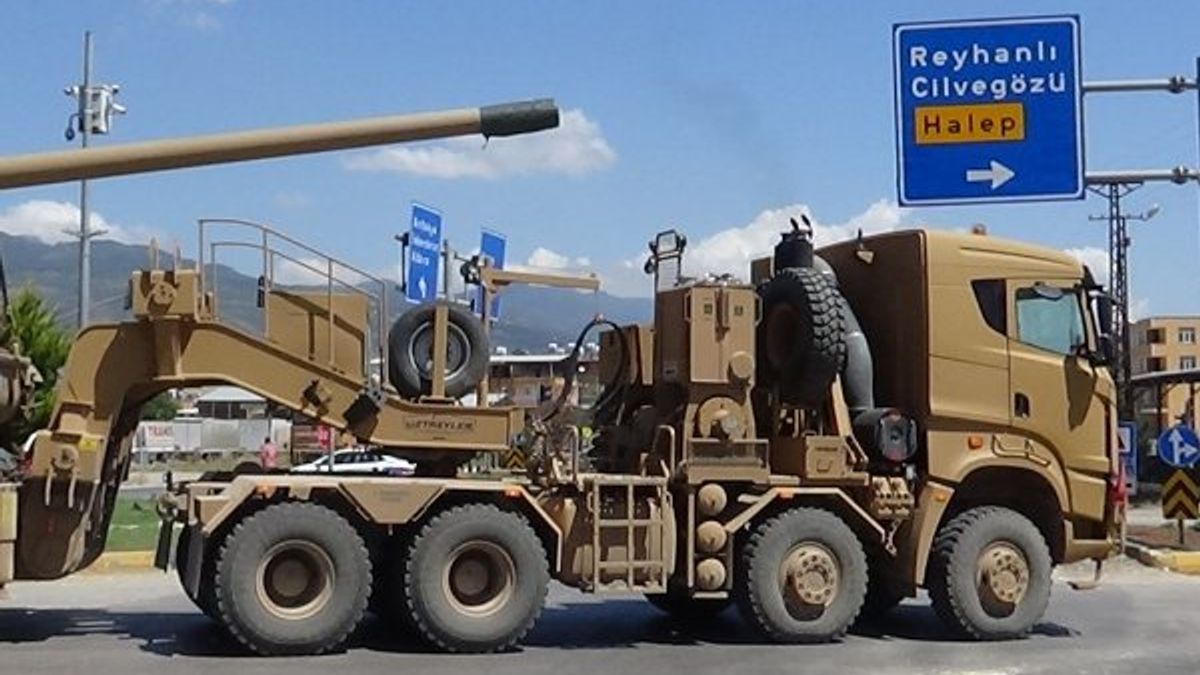 Birliklerden gönderilen askeri personelleri taşıyan otobüsler ve tırlara yüklenmiş obüsler, geniş güvenlik önlemleri altında Kırıkhan ilçesinden geçerek Hatay'daki sınır birliklerine doğru devam etti.