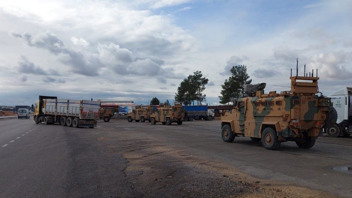 Gaziantep istikametine seyir eden konvoydaki frekans karıştırıcı sistemlerin bulunduğu çok sayıda zırhlı personel taşıyıcı araç, mühimmat ve malzeme taşıyan zırhlı araçlar ile mühimmat ve malzeme saklamada kullanılan konteynerleri taşıyan kamyonetler, Nizip ilçesinde görüntülendi.