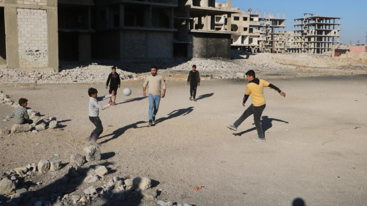 Rejim saldırıları sonucu enkaza dönen mahalledeki futbol sahası, çocuklar için yeniden oyun alanı oldu.