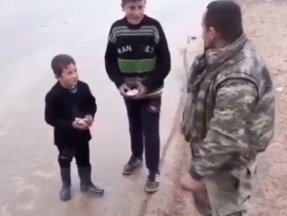 Devriye gezen askerlerden biri, elindeki ekmeği ile çocukların yanına gitti. Ekmeği bölüştürerek çocuklara dağıtan askeri, gruptaki başka bir asker kayda aldı.