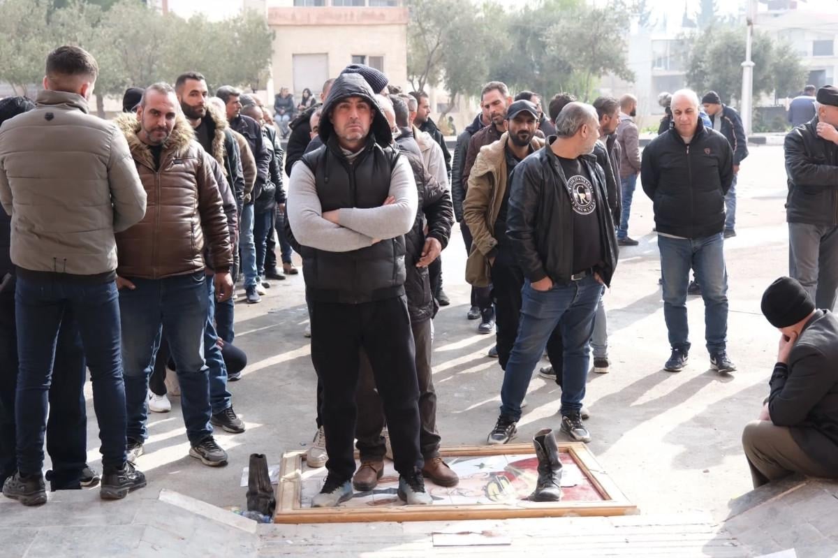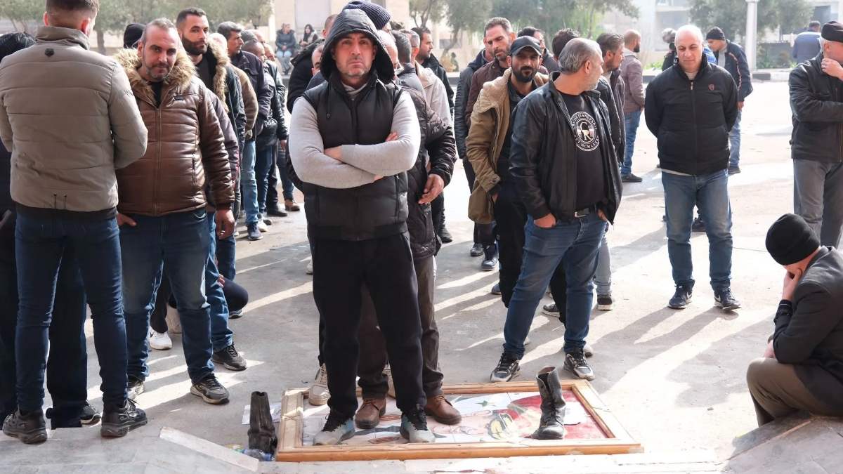 Sıraya giren kalabalık, öncelikle yerdeki Esad portresine basarak binanın önüne kadar ilerledi.