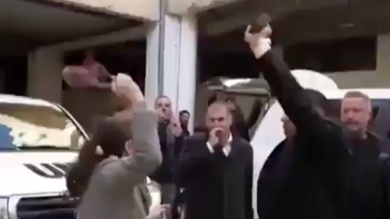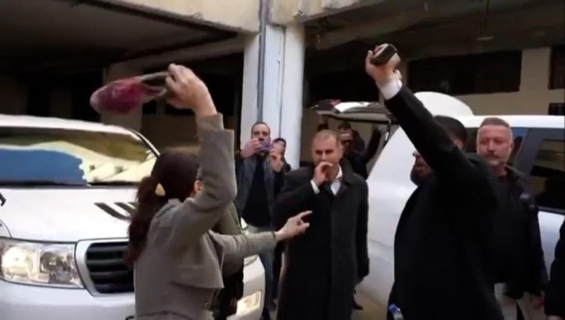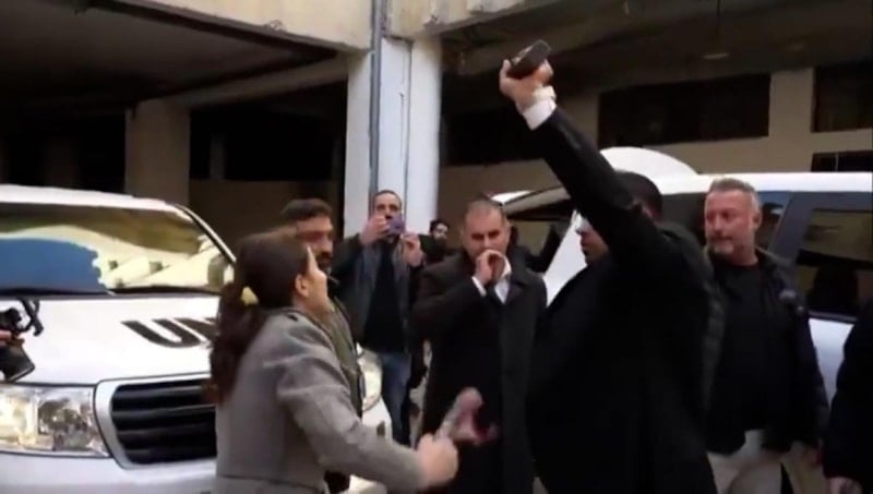Ayağından çıkardığı ayakkabıyı BM yetkililerine doğru sallayan Suriyeli kadın, "Şimdi mi geldiniz, her şey bittikten sonra mı geldiniz? Sizi istemiyoruz artık, gidin" diyerek bağırdı.