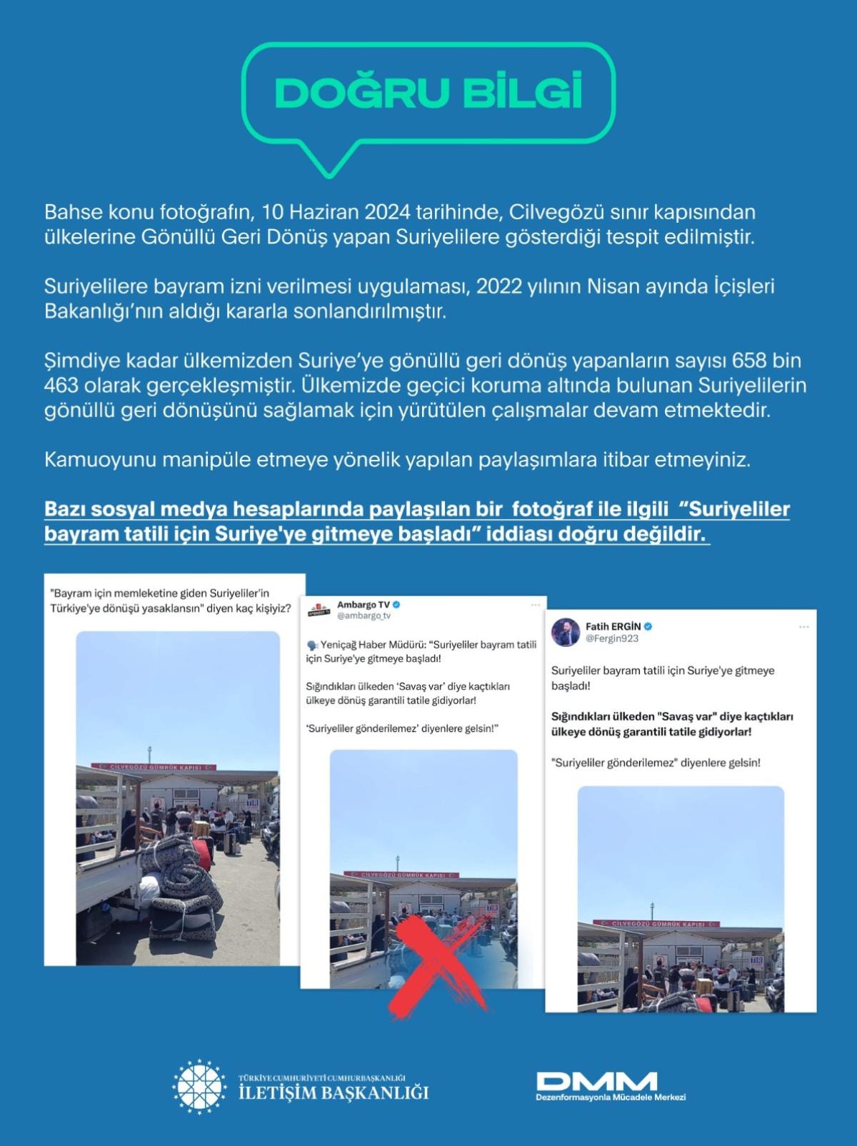 Bahse konu fotoğrafın, 10 Haziran 2024 tarihinde, Cilvegözü Sınır Kapısı'ndan ülkelerine Gönüllü Geri Dönüş yapan Suriyelileri gösterdiği tespit edilmiştir.