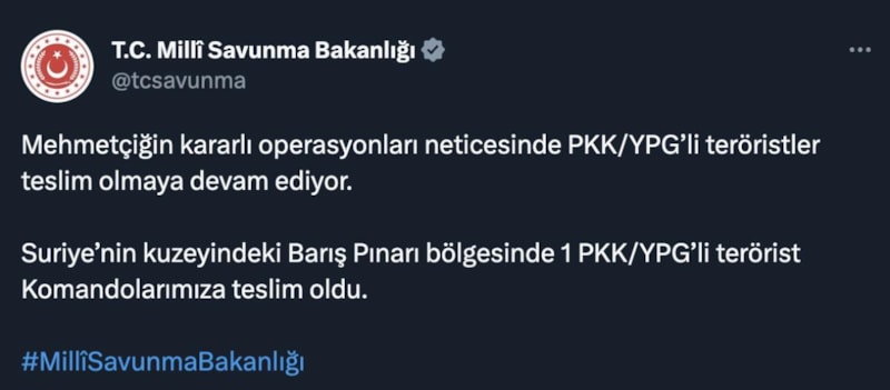 Bakanlıktan yapılan açıklamada, bir teröristin teslim olduğu söylenirken şu ifadelere yer verildi:
