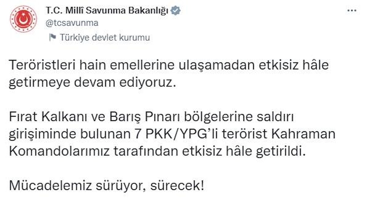 Teröristleri hain emellerine ulaşamadan etkisiz hâle getirmeye devam ediyoruz. Fırat Kalkanı ve Barış Pınarı bölgelerine saldırı girişiminde bulunan 7 PKK/YPG’li terörist Kahraman Komandolarımız tarafından etkisiz hâle getirildi. Mücadelemiz sürüyor, sürecek!