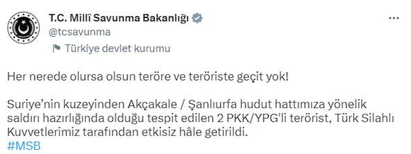 Suriye’nin kuzeyinden Akçakale / Şanlıurfa hudut hattımıza yönelik saldırı hazırlığında olduğu tespit edilen 2 PKK/YPG'li terörist, Türk Silahlı Kuvvetlerimiz tarafından etkisiz hâle getirildi.