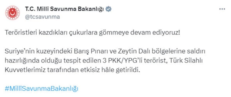 Suriye’nin kuzeyindeki Barış Pınarı ve Zeytin Dalı bölgelerine saldırı hazırlığında olduğu tespit edilen 3 PKK/YPG’li terörist, Türk Silahlı Kuvvetlerimiz tarafından etkisiz hâle getirildi.