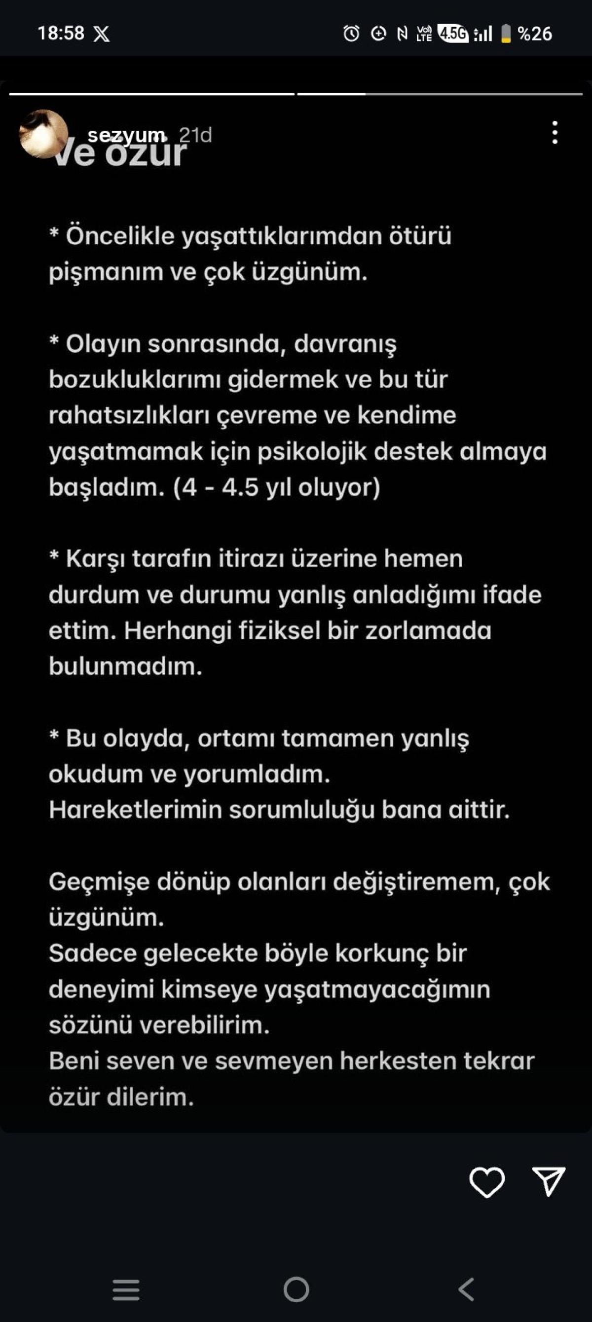 Bunun akabinde de Sezyum, Instagram'dan sürpriz bir paylaşım yaparak hakkındaki taciz iddiasını kabul etti.