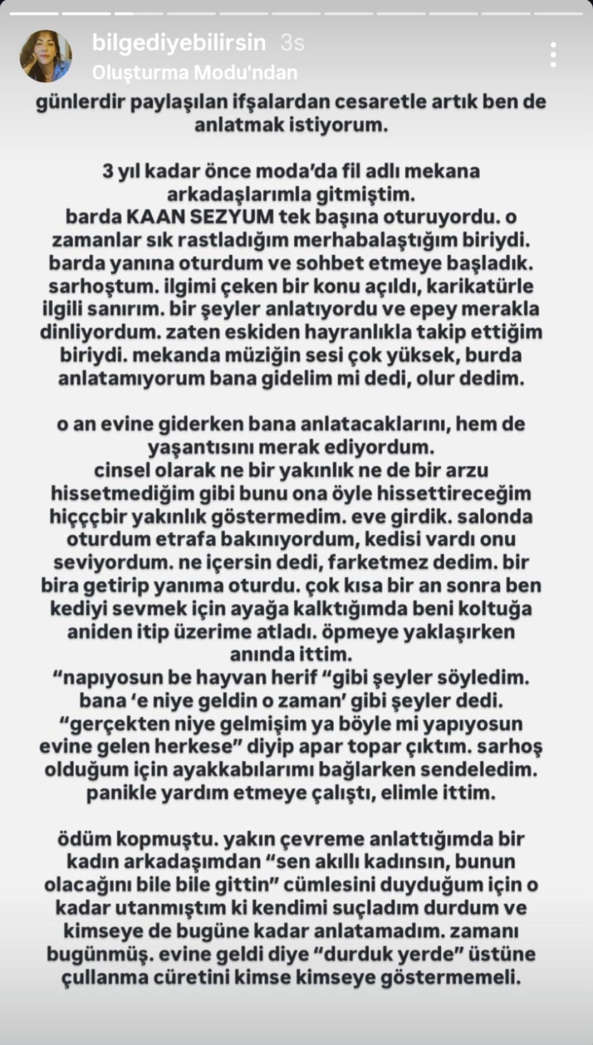 Bir kadın, sosyal medya hesabından yaklaşık üç yıl önce yaşadığı bir olayı anlattı ve Kaan Sezyum'un kendisini taciz ettiğini söyledi.