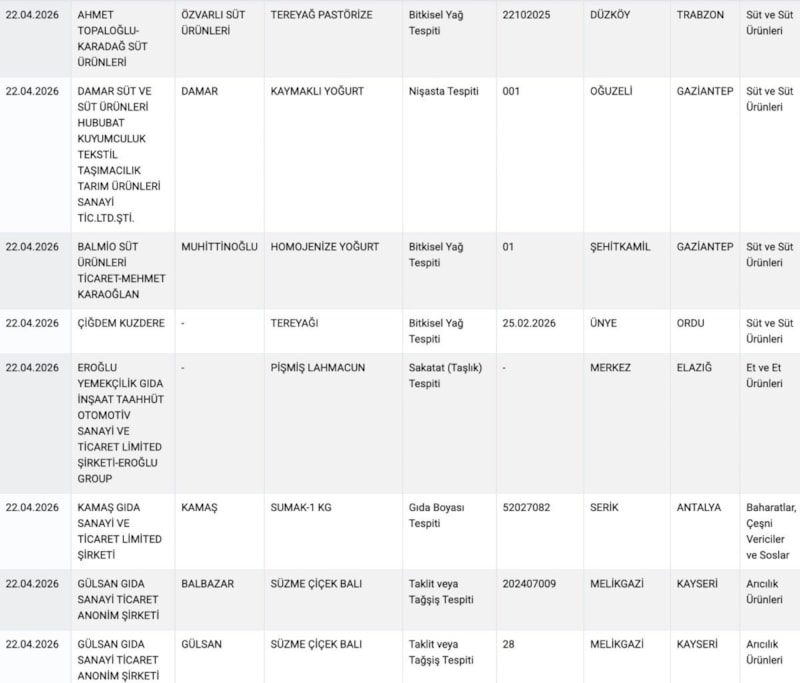 Açıklanan yeni listede süt ürünleri, bal ve baharat gibi farklı kategorilerde çok sayıda ürün yer aldı.