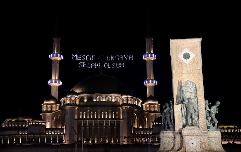 Taksim Camii'ne Ramazan hazırlıkları sırasında asılan dijital mahya İsrail güçlerinin Mescid-i Aksa'ya saldırılarının ardından Mescid-i Aksa'ya selam olsun'' yazısıyla değişti.
