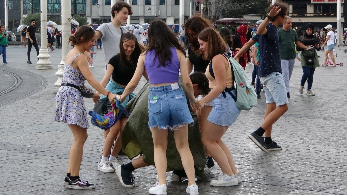 Meydan ve civarındaki pek çok kişi yağmurdan kaçarken, bir grup yabancı genç ise ilginç bir şey yaptı. Oturdukları yerden kalkan gençler bir halka oluşturdu ve dans etmeye başladı. Çevredekiler de gençlerin bu gösterisini şaşkın gözlerle izledi.
