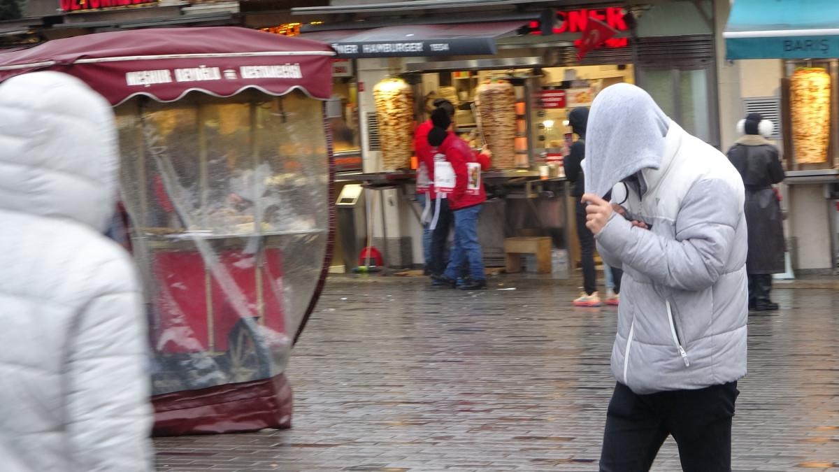 Saatler ilerledikçe daha da şiddetlenen rüzgar ile yağış nedeniyle Taksim Meydanı’nda yürüyen vatandaşlar zor anlar yaşadı.