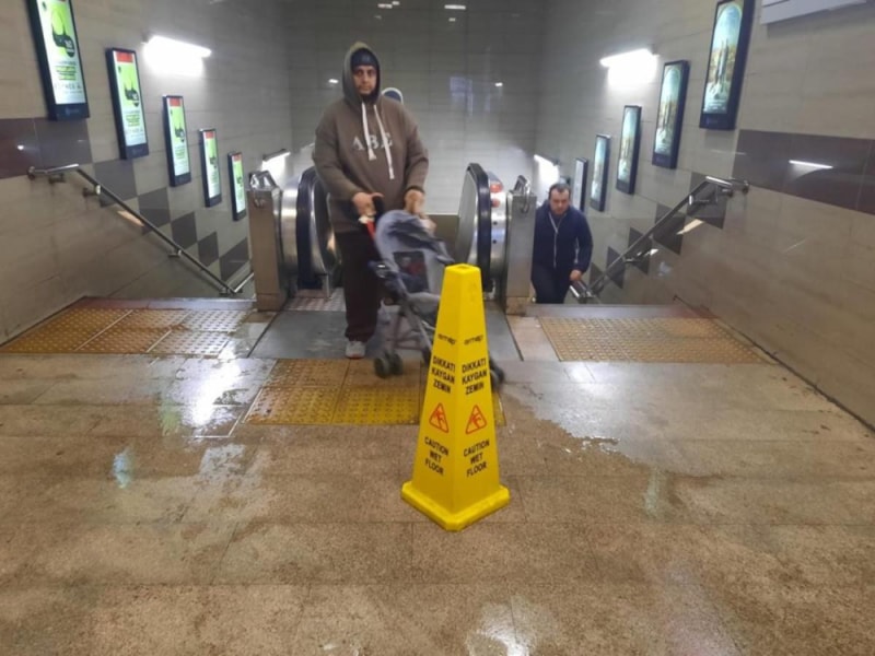 Metronun duvarlarından ve merdivenlerinden suların aktığı görülürken, su birikintilerinin oluştuğu alanlara uyarı levhaları konularak önlem alındığı görüldü.