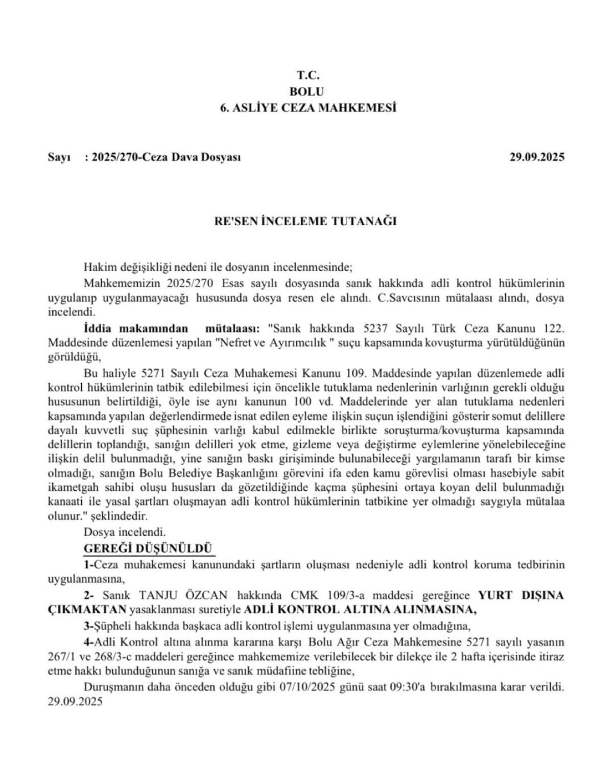 - Özcan hakkında, Bolu 6. Asliye Ceza Mahkemesi'nde açılan dava sonrası adli kontrol kararı verildi.