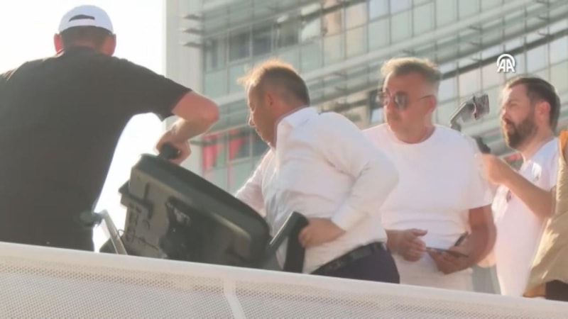 Özcan, burada konuşma yaptığı otobüsün üzerinden aşağı koltuk attı.