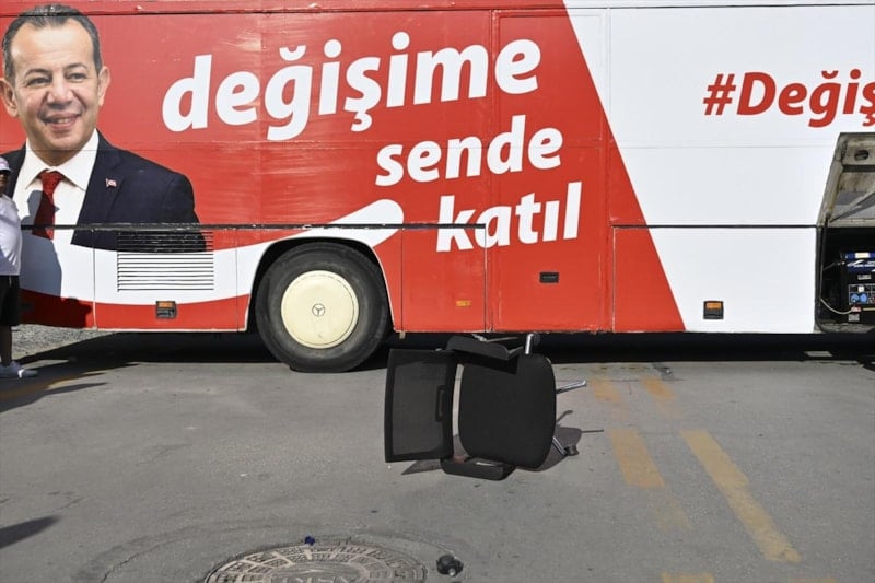 Bolu Belediye Başkanı Tanju Özcan, Ankara'ya yürüyüşünün son gününde CHP Genel Merkezi'ne ulaştı. Özcan, burada konuşma yaptığı otobüsün üzerinden aşağı sandalye attı.