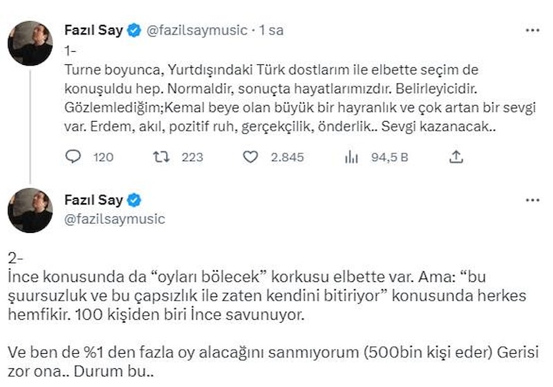 Bunun üzerine adaylığını açıkladığı andan itibaren ünlü isimlerin tepkisini çeken İnce'ye piyanist Fazıl Say'dan bir gönderme daha geldi.
